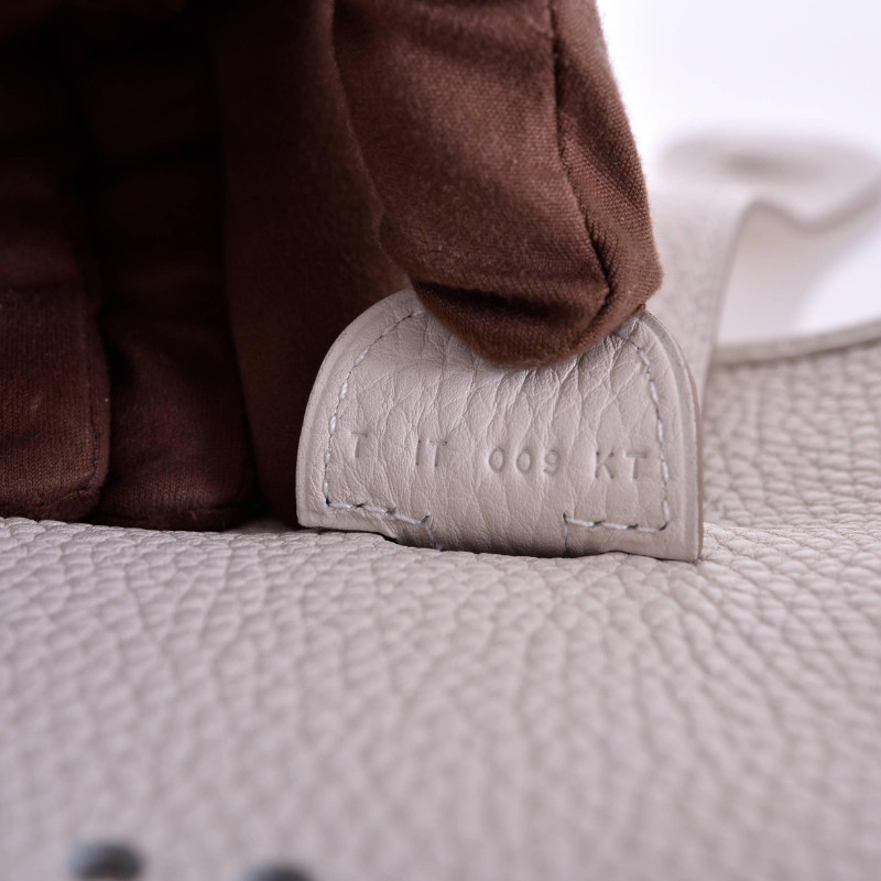 This Hermès Evelyne III GM bag is of Craie Clemence leather with palladium hardware, tonal stitching, large perforated H in circle (front), pull tab top snap closure and removable, adjustable Craie shoulder/crossbody strap.