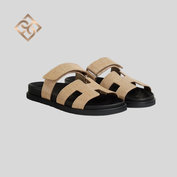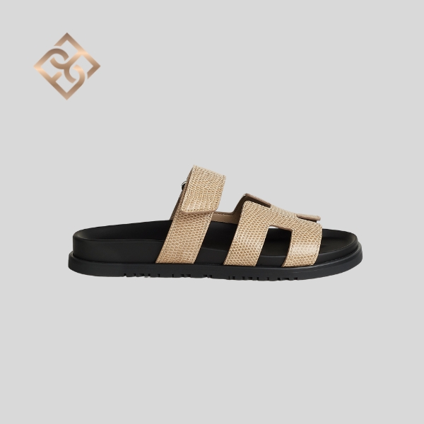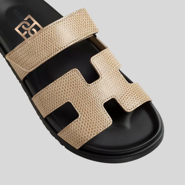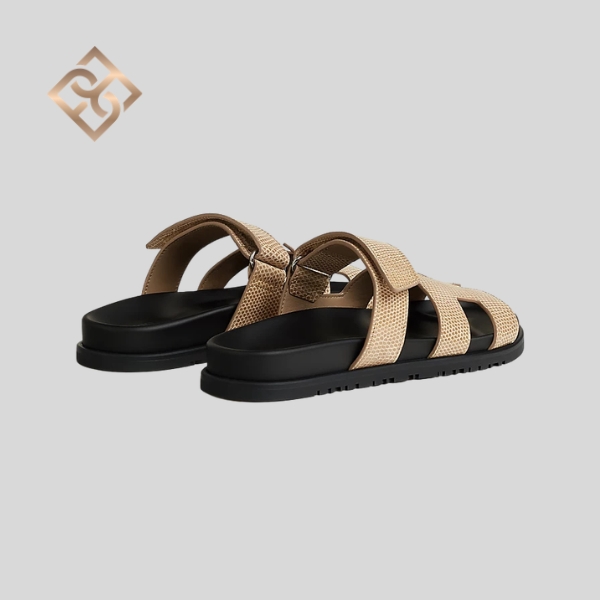 Techno-sandal in shiny Niloticus lizard with anatomical rubber sole and adjustable strap.