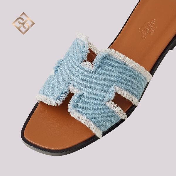 Sandal in Bleu Clair denim fringe fabric with iconic “H” cut-out.