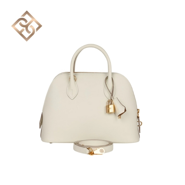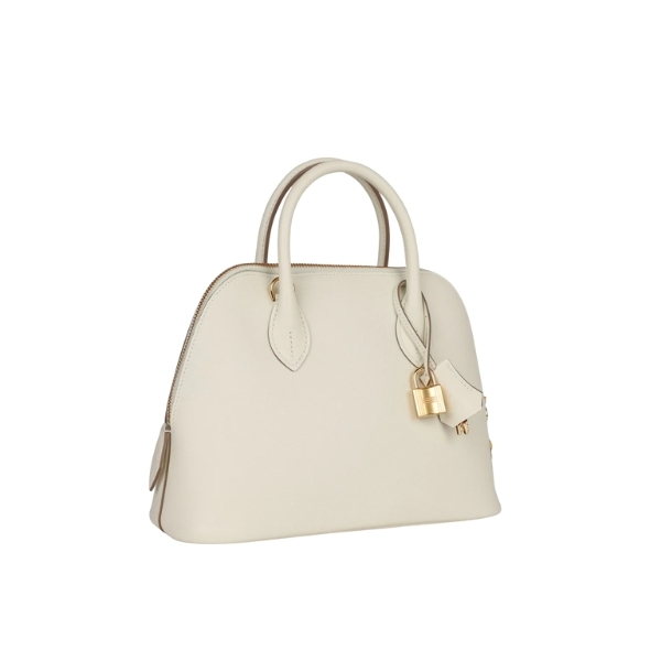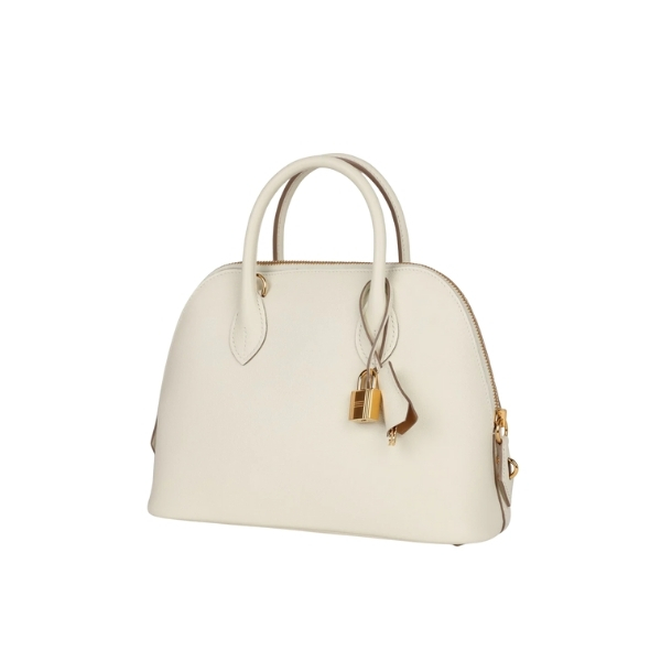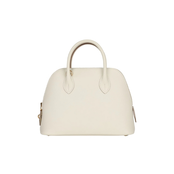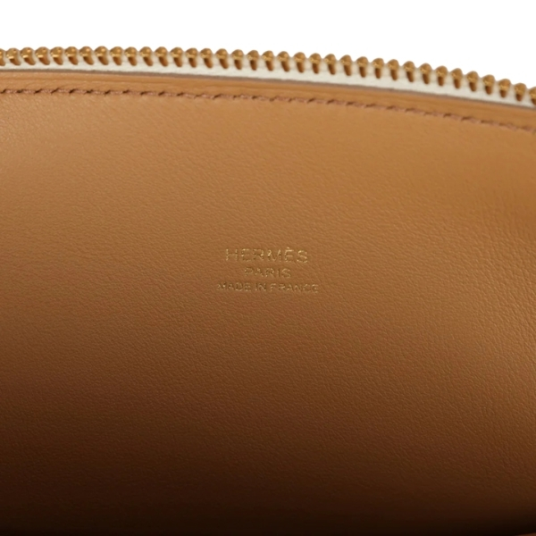 This 1923 Bolide is in Mushroom evercolor leather with gold hardware and has tonal stitching, a top zipper closure, double rolled handles and removable shoulder strap.
