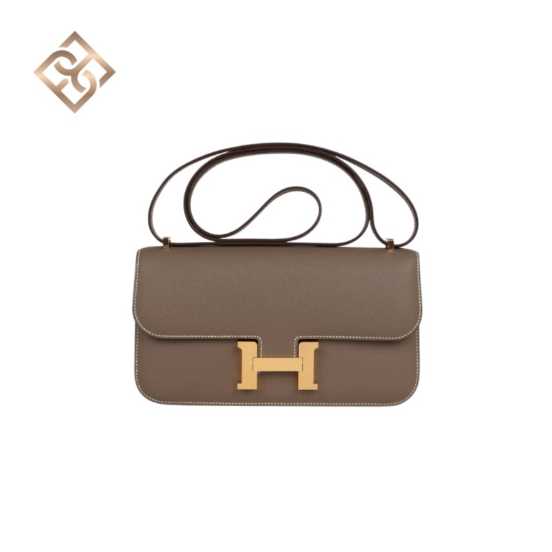 This Hermès Constance 1-Elan is in Etoupe Epsom leather with gold hardware, featuring contrast stitching, metal “H” snap closure, and an adjustable strap.
