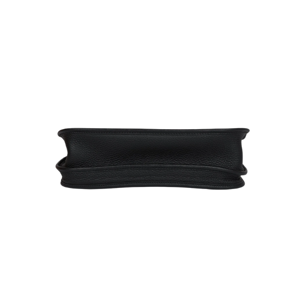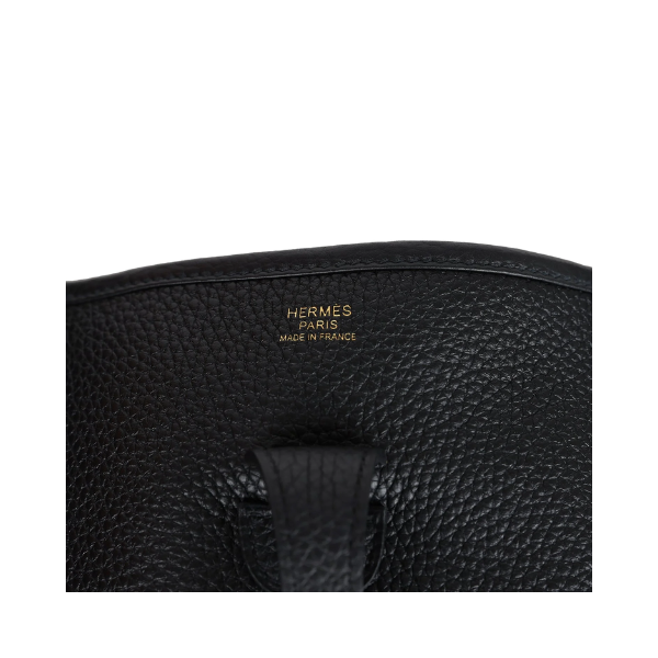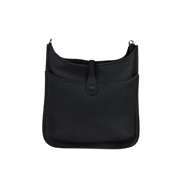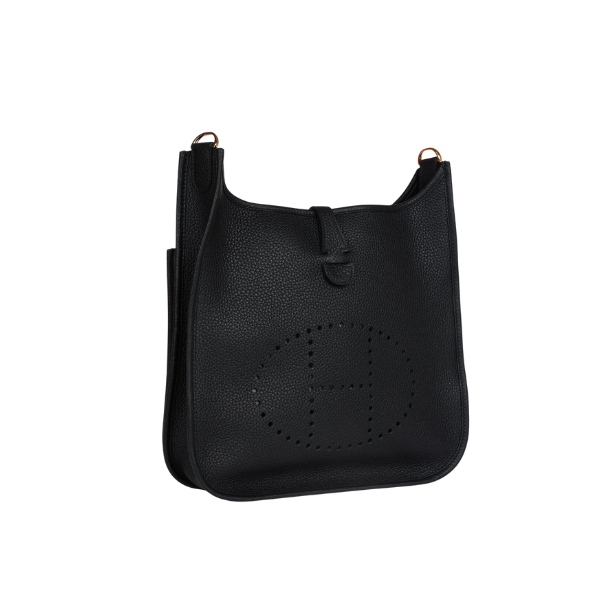 This is an authentic Hermès Evelyne III PM Black Clemence Gold Hardware. This messenger bag in the smallest size is crafted of rich taurillon clemence calfskin leather in GHW. The bag features a canvas body strap, polished palladium silver hardware, and a perforated Hermes H oval logo. The top of the bag opens with a crossover strap to a suede interior. This is a perfect compact messenger bag with the sophistication of Hermes!