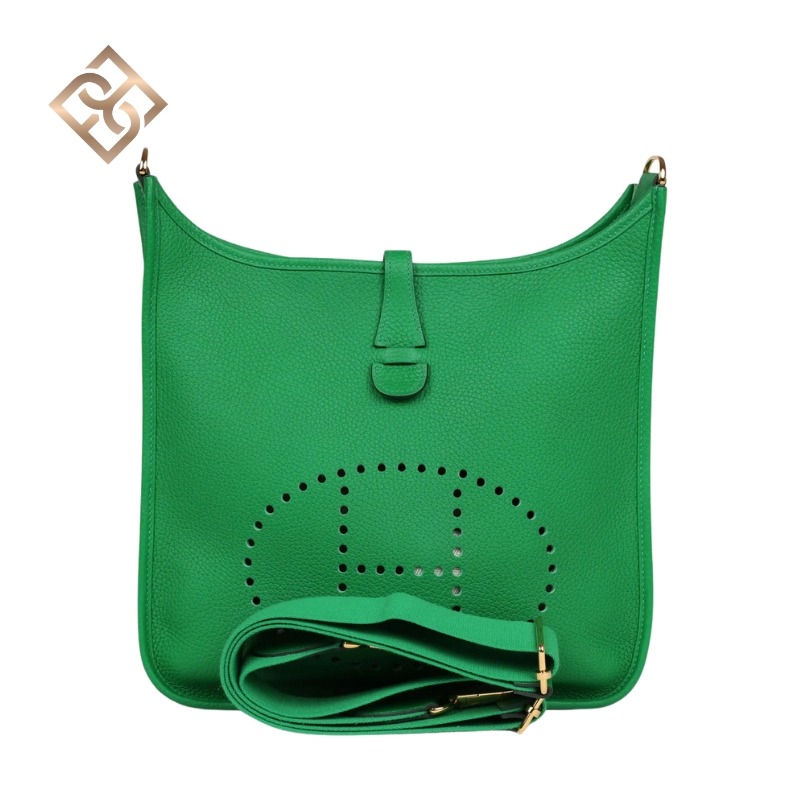 This Evelyne is in Bambou clemence leather with gold hardware and has tonal stithcing, a pull tab top closure, and a removable Bambou canvas and leather shoulder/crossbody strap.