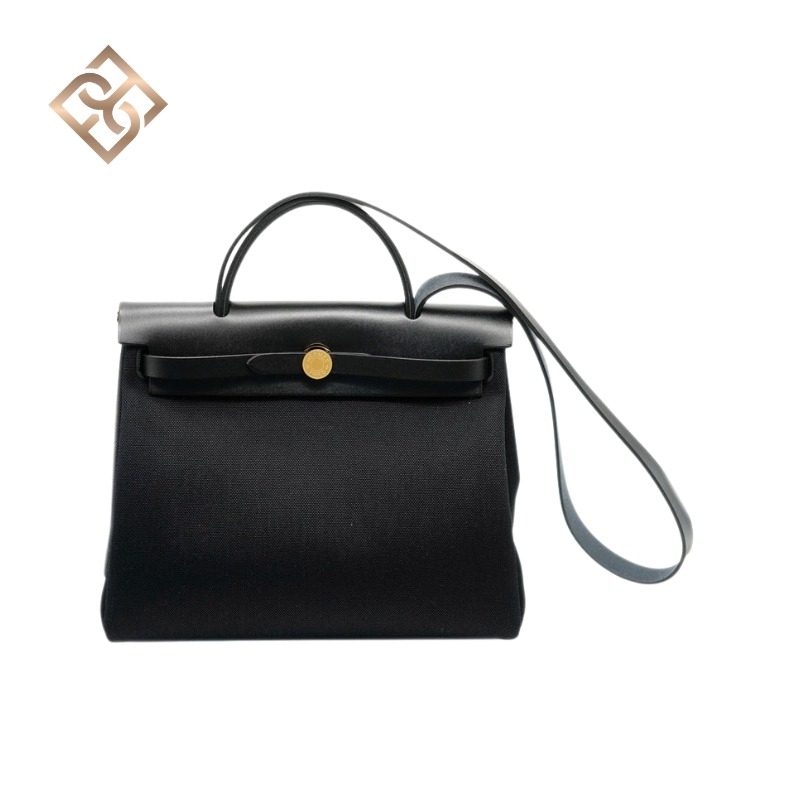 This Hermès Black Herbag 2023 Black canvas and leather with gold hardware. It features a flap top with a leather tab closure, a front zip pocket, and a single rolled leather handle. The Herbag 2023 also includes a detachable shoulder strap.