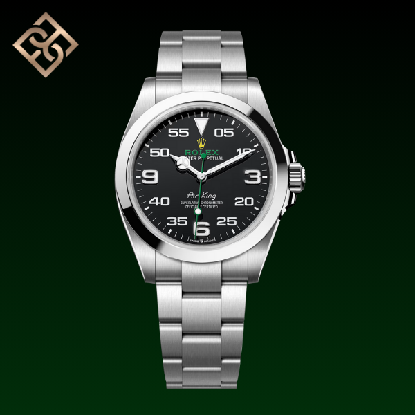 With its 40 mm case in Oystersteel, solid-link Oyster bracelet, and distinctive black dial, the Air-King perpetuates the aeronautical heritage of the original Rolex Oyster.