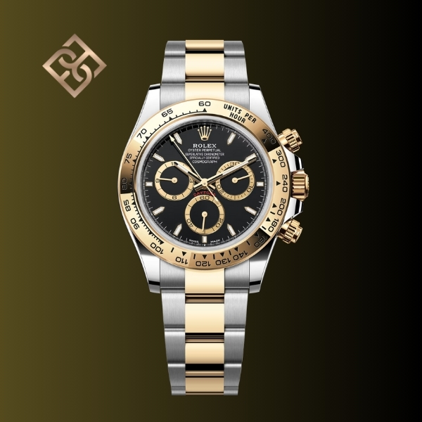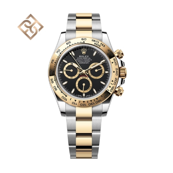 The Oyster Perpetual Cosmograph Daytona in Oystersteel and yellow gold with a black dial and contrasting counter rings. It features an Oyster bracelet and a yellow gold bezel with an engraved tachymetric scale.