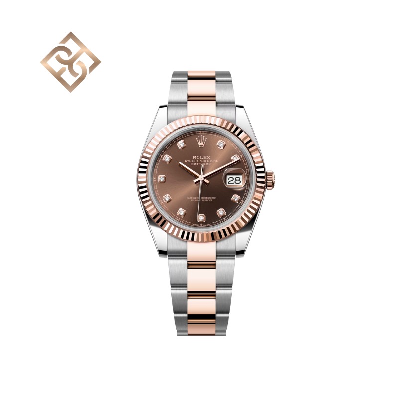 This Oyster Perpetual Datejust 41 in Oystersteel and Everose gold features a chocolate, diamond-set dial and an Oyster bracelet.