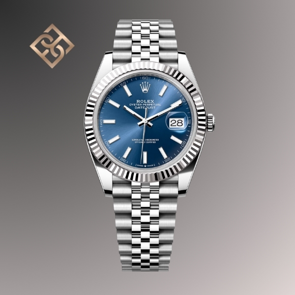 This Oyster Perpetual Datejust 41 in Oystersteel and white gold features a bright blue dial and a Jubilee bracelet.
