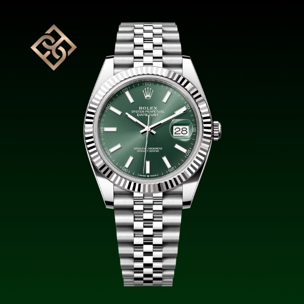 This Oyster Perpetual Datejust 41 in Oystersteel and white gold features a mint green dial and a Jubilee bracelet.