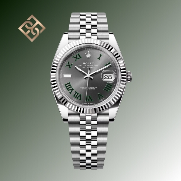 This Oyster Perpetual Datejust 41 in Oystersteel and white gold features a slate dial and a Jubilee bracelet.