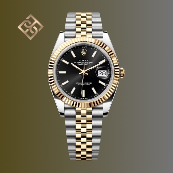 This Oyster Perpetual Datejust 41 in Oystersteel and yellow gold features a bright black dial and a Jubilee bracelet.