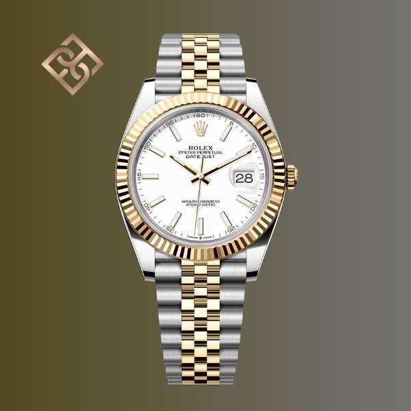 This Oyster Perpetual Datejust 41 in Oystersteel and yellow gold features a white dial and a Jubilee bracelet.