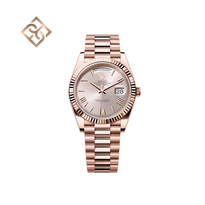 The Oyster Perpetual Day-Date 40 in 18 kt Everose gold with a sundust dial, fluted bezel and a President bracelet.