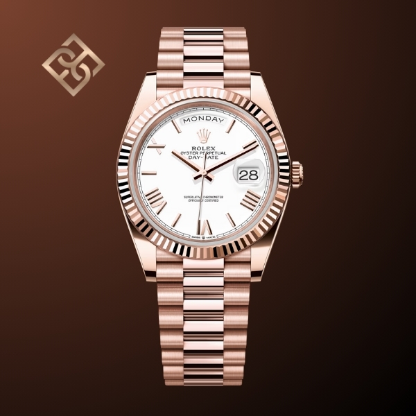 The Oyster Perpetual Day-Date 40 in 18 kt Everose gold with a white dial, fluted bezel and a President bracelet.