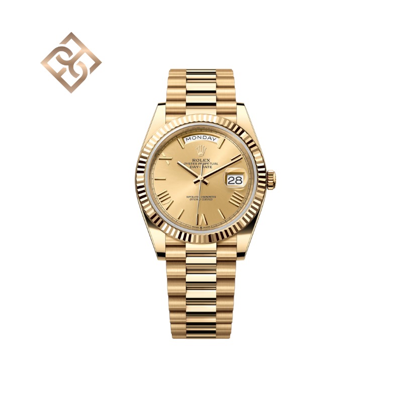The Oyster Perpetual Day-Date 40 in 18 kt yellow gold with a champagne-colour dial, fluted bezel and a President bracelet.