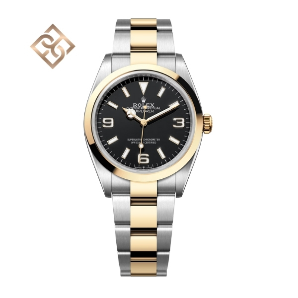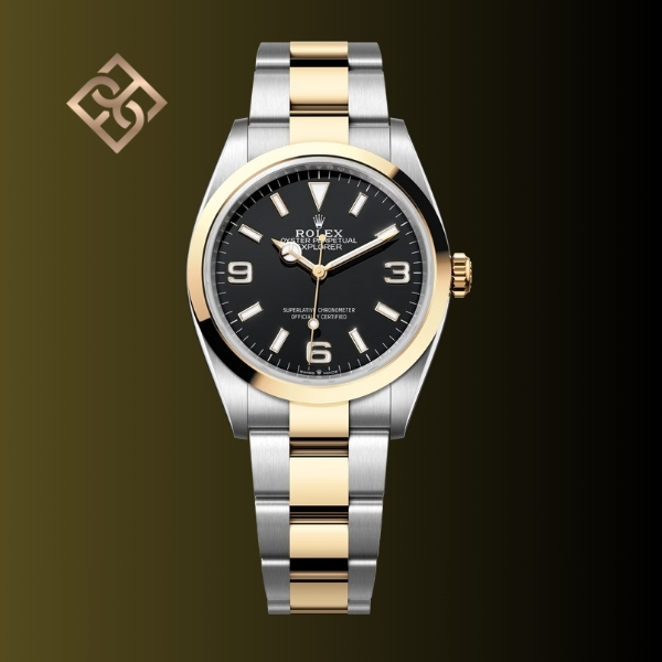 The Oyster Perpetual Explorer 36 in Oystersteel and yellow gold features a distinctive black dial with characteristic 3, 6, and 9 numerals with a Chromalight display.