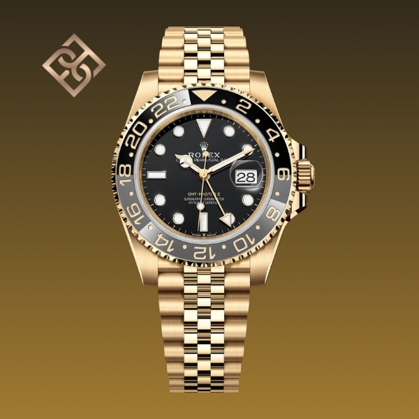 The Oyster Perpetual GMT-Master II in 18 kt yellow gold with a black dial and a Jubilee bracelet.