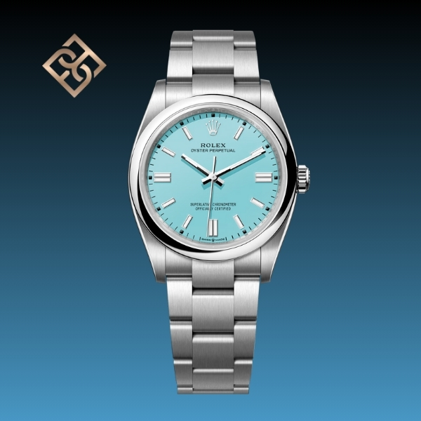 The Oyster Perpetual 36 with a turquoise blue dial and an Oyster bracelet.