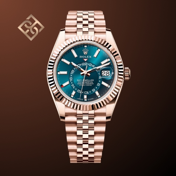 The Oyster Perpetual Sky-Dweller in 18 kt Everose gold with a blue-green dial and a Jubilee bracelet.