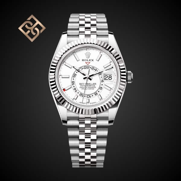 The Oyster Perpetual Sky-Dweller in Oystersteel and white gold with an intense white dial and a Jubilee bracelet.