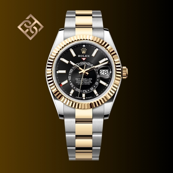 The Oyster Perpetual Sky-Dweller in Oystersteel and yellow gold with a bright black dial and an Oyster bracelet.