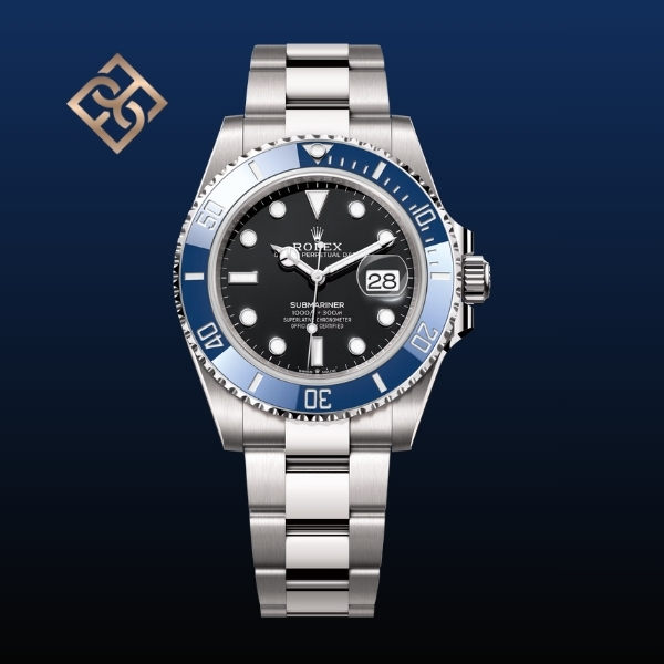 The Oyster Perpetual Submariner Date in 18 kt white gold with a Cerachrom bezel insert in blue ceramic and a black dial with large luminescent hour markers.